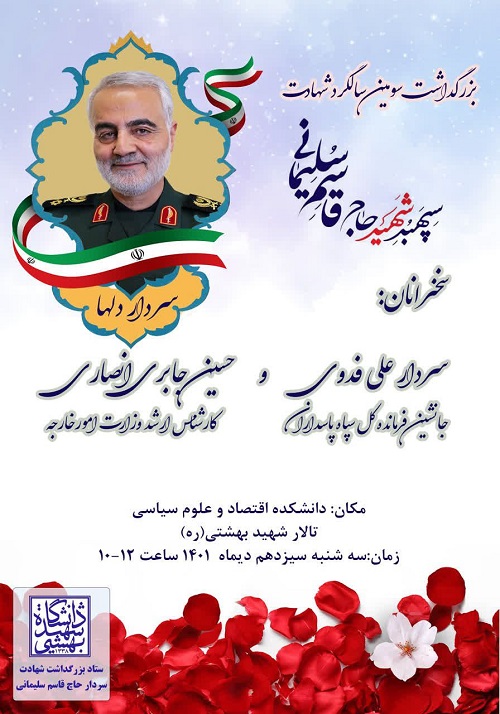 مراسم بزرگداشت سومین سالگرد شهادت سپهبد حاج قاسم سلیمانی برگزار می شود 2222 بازدید print share مراسم بزرگداشت سومین سالگرد شهادت سپهبد حاج قاسم سلیمانی؛ سه شنبه 13 دی ماه، 1401 برگزار میشود. این...
